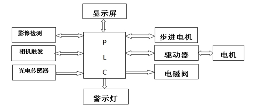 (2)顯示屏 操作人員與設備的交互對話窗口。通過與PLC實時通信,實現(xiàn)對設備工作參數(shù)的設定、運行狀態(tài)的監(jiān)控顯示、檢測結果的實時輸出、圖像檢測狀態(tài)、數(shù)據(jù)統(tǒng)計顯示等功能。